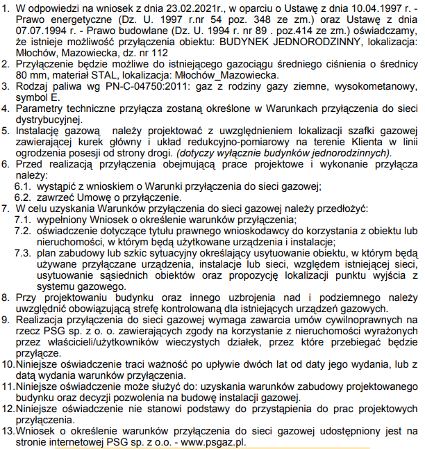 - Gaz – Przyłącze będzie możliwe, informacja od gazowni: