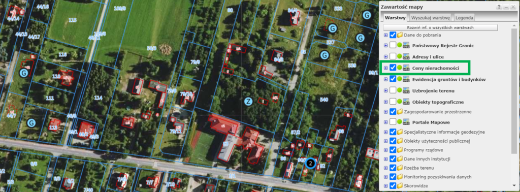 Po otworzeniu mapy i dodaniu warstwy „Ceny nieruchomości”, na działkach, których ceny transakcyjne są dostępne, pojawią się niebieskie znaczniki: